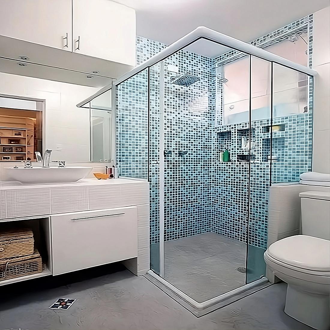 Com altura padrão de 1,90m, o box proporciona excelente contenção de respingos, mantendo o banheiro sempre seco e organizado. Seu formato de canto é indicado para vãos de 100x100cm, sendo perfeito para banheiros maiores ou projetos que valorizam conforto e sofisticação.