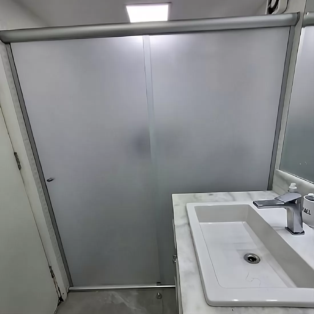 ✅ Design discreto e elegante: vidro jateado que valoriza o ambiente, facilita a limpeza e mantém a privacidade.